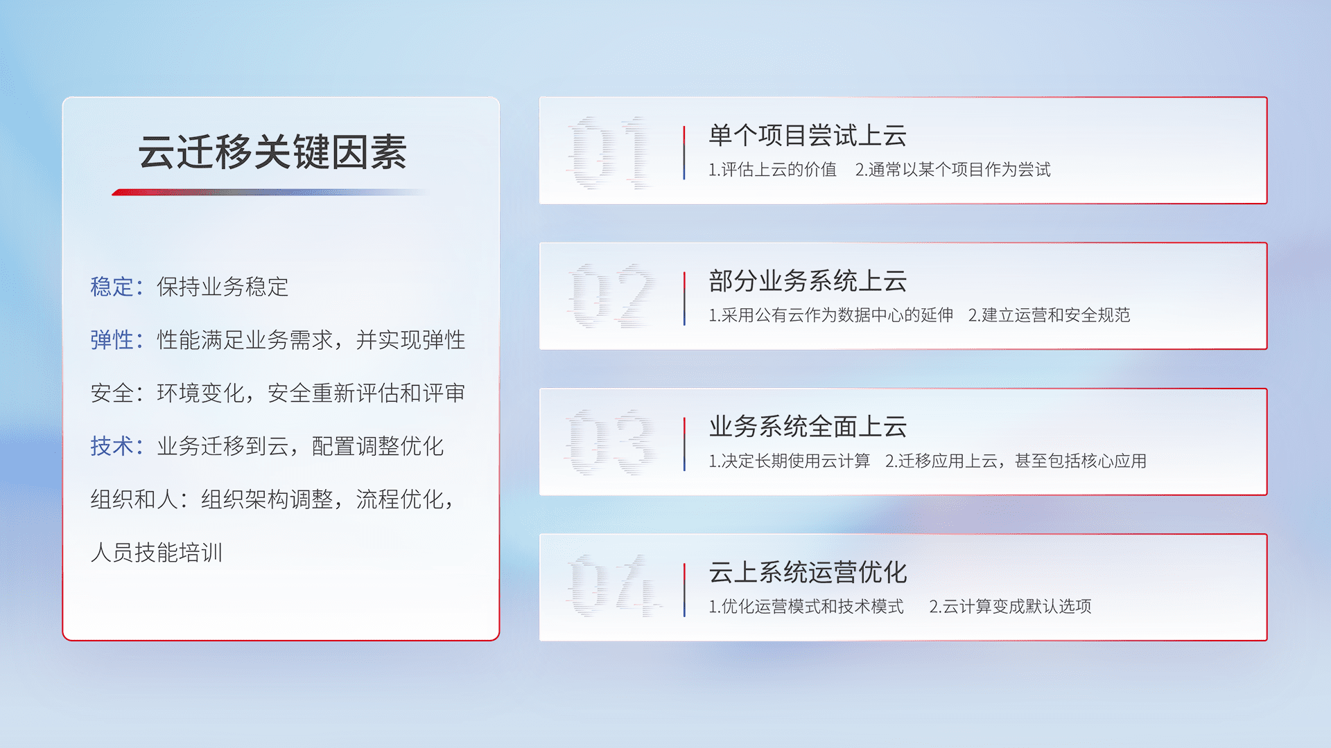 结合实际业务,,,从规划设计、、、、云平台选型、、、云原生改造、、数据迁移、、、、集成交付,,,,迁移全过程为客户识别最佳上云路径,,,做好风险识别管理,,设计网络架构、、、身份权限、、安全审计合规、、、、操作审计、、日志审计、、监控告警策略、、多站点容灾设计等,,,,对云上基础设施进行整体规划,,,提升IT治理水平,,,以满足弹性、、、高可用、、、、高性能的需求。。